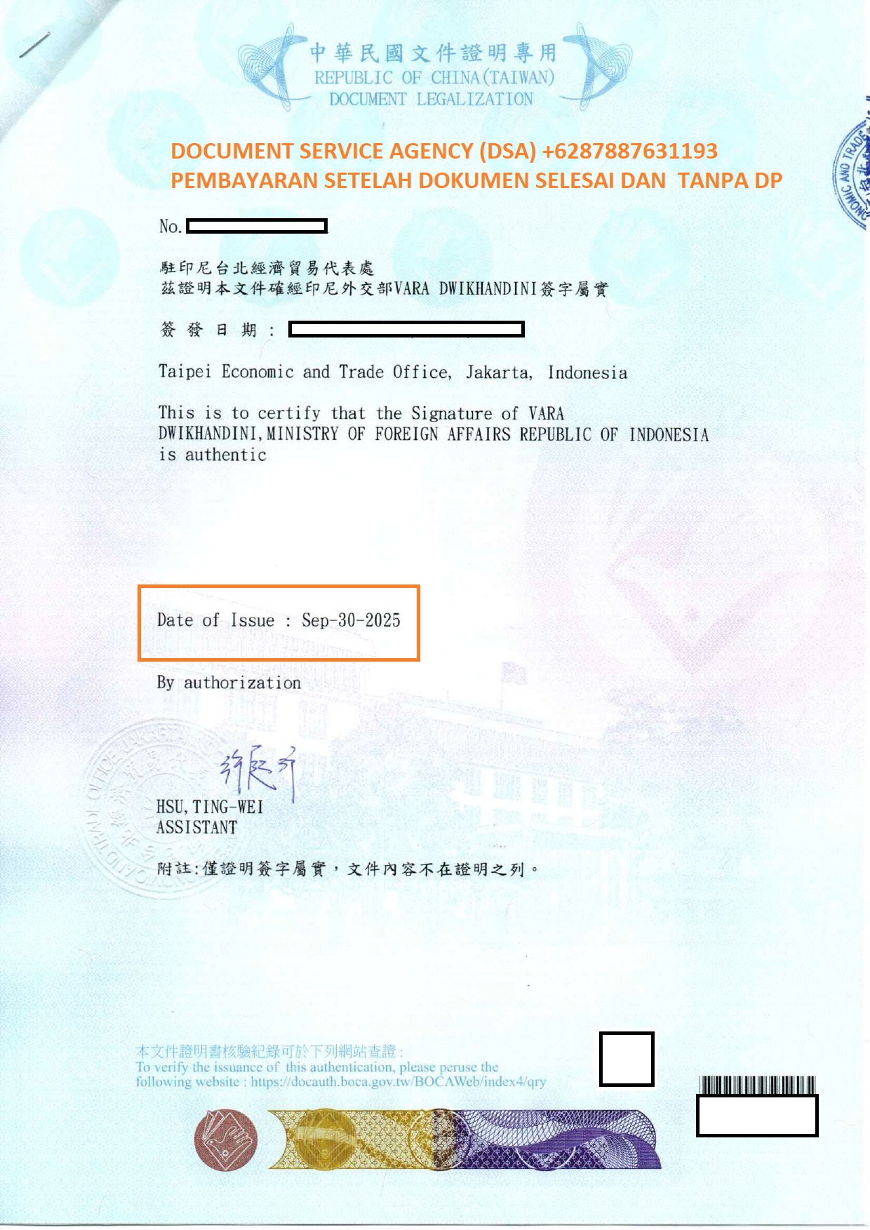 Document Service Agency (DSA) adalah spesialis jasa terjemah, legalisir, atestasi, apostile dokumen untuk keperluan di luar negeri dan pengurusan visa berpengalaman dan terpercaya. Bagi anda yang ingin melegalisir ijazah di Kedutaan Taiwan untuk study, keperluan bekerja, pengurusan visa, izin tinggal, dan lain-lain. Percayakan legalisir dokumen anda kepada kami, dengan layanan ” Pembayaran Setelah Dokumen Selesai dan Tanpa DP ” anda akan merasa lebih nyaman dan aman menggunakan jasa kami. Dan dalam hitungan beberapa hari dokumen anda selesai dan siap untuk digunakan.